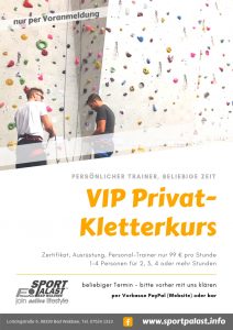 Du möchtest einen persönlichen Klettertrainer zu deinem persönlichen Wunschtermin für deine persönlich gewünschte Dauer und persönliche Bedürfnisse? Dann bieten wir dir gerne dieses VIP-Angebot.