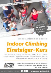 In unserem Kurs lernst du alles, was du zum eigenständigen Klettern mit anderen brauchst! Zu jeder Buchung gibt es 2x Betreutes Klettern (i. W. v. ca. 60 €) geschenkt! Dort kannst du das Gelernte noch weiter mit unseren Trainern festigen. Alle weiteren Infos auf dem Flyer (klicke auf das Bild zum Vergrößern).